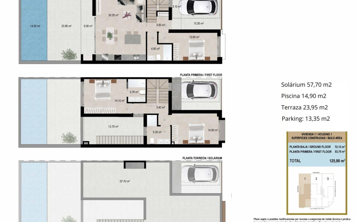 Nieuwbouwwoningen in San Javier - Modern design en bevoorrechte locatie Hedendaags design herenhuizen met prive zwembad Ontdek dit exclusieve complex van drie gloednieuwe herenhuizen in San Javier, Murcia, ontworpen om maximaal comfort en een moderne levensstijl te bieden. Elke woning heeft een privézwembad, terras, solarium en parkeerplaats, en biedt zo een ideale ruimte voor ontspanning en plezier het hele jaar door. De woningen zijn gebouwd met hoogwaardige materialen en een open ontwerp dat optimaal gebruik maakt van natuurlijk licht. Ze zijn perfect voor zowel een permanente verblijfplaats als een vakantiehuis aan de Costa Cálida. Distributie en uitrusting van hoge kwaliteit Elk herenhuis heeft: 3 ruime slaapkamers met inbouwkasten en ladekast. 3 volledig ingerichte badkamers met meubels, spiegels en schermen. Open keuken, volledig ingericht en inclusief witgoed. Ruime woon-eetkamer, met grote ramen die aansluiten op het terras. Privézwembad met douche en tuin met kunstgras. Solarium met zomerkeuken, perfect om te genieten van het mediterrane klimaat. Pre-installatie van airconditioning op elke verdieping. PVC buitenschrijnwerk met dubbele beglazing, waardoor thermische en akoestische isolatie gegarandeerd is. Beveiligde toegangsdeur, voor meer gemoedsrust en bescherming. Strategische ligging in San Javier San Javier is een kustplaats met een breed scala aan diensten, sportfaciliteiten en recreatiegebieden. De locatie van deze woonwijk biedt snelle toegang tot: Stranden van de Mar Menor - Slechts 5 minuten met de auto. Stranden van de Middellandse Zee - Op 10 minuten afstand. Golfbanen - Verschillende mogelijkheden in de omgeving, ideaal voor golfliefhebbers. Winkelcentra en diensten - Alles wat je nodig hebt op slechts een paar minuten afstand. Luchthaven Murcia-Corvera - 30 minuten rijden. Vliegveld Alicante - 45 minuten rijden. Geniet van het beste klimaat en de beste levenskwaliteit in San Javier San Javier is een uitstekende optie voor wie op zoek is naar een woning dicht bij zee, met een bevoorrecht klimaat en toegang tot allerlei buitenactiviteiten. Mis de kans niet om een van deze exclusieve woningen te kopen. Neem vandaag nog contact met ons op voor meer informatie of om een bezichtiging te plannen.