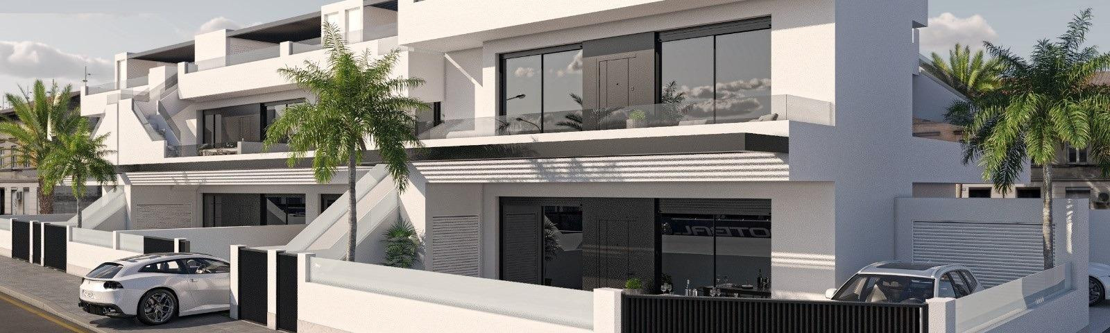 Luxury Villas in San Pedro del Pinatar - Modern Living in a Prime Location Overview of Stunning New-Build Villas Discover the epitome of luxury living in San Pedro del Pinatar with these exceptional new-build villas. Each villa is thoughtfully designed with meticulous attention to detail, offering spacious and sunlit interiors that blend style with comfort. These villas feature an open-plan living room, dining area, and kitchen, creating a seamless flow throughout the main living space. With 3 bedrooms, including a master suite complete with a walk-in closet and ensuite bathroom, these homes are perfect for those seeking both elegance and functionality. Private Outdoor Spaces and High-End Amenities Each villa is set on a private plot of approximately 200 square meters, providing ample space for outdoor living and relaxation. The property includes a private pool, perfect for enjoying warm Mediterranean days, and a designated parking area. An expansive private solarium offers a beautiful space for sunbathing, entertaining, or simply enjoying the peaceful surroundings. These villas offer a high-quality lifestyle with premium amenities and modern comforts in one of Spain’s most desirable coastal areas. Prime Location in San Pedro del Pinatar San Pedro del Pinatar is known for its beautiful beaches, vibrant community, and close proximity to essential services and leisure activities. Located just 900 m from the beach and water sports facilities, these villas allow residents to enjoy all the natural beauty and recreational opportunities of the Mar Menor coast. The villas are also conveniently close to a wide range of local amenities, including shops, restaurants, and bars. Larger shopping centers are just a short drive away, providing residents with easy access to a variety of retail options. Close Proximity to Key Points of Interest Murcia-Corvera Airport: Approximately 30 km away, offering convenient international and domestic travel options. Alicante Airport: Just an hour's drive (around 85 km), providing access to numerous global destinations. Several Golf courses like Lo Romero, Roda Golf or La Serena within a short drive, perfect for golf enthusiasts. Shopping Centers: A 10-minute drive to Dos Mares Shopping Center, offering various retail stores, restaurants, and entertainment options. Beaches of Mar Menor: Just 900 m from the villas, these sandy shores are ideal for relaxation, swimming, and water activities. Experience the Charm of San Pedro del Pinatar San Pedro del Pinatar offers the charm of a traditional Spanish coastal town while providing all modern conveniences. Its strategic location near the Mar Menor and Costa Cálida ensures easy access to beautiful beaches, high-quality amenities, and a vibrant local culture, making it the ideal place to call home.