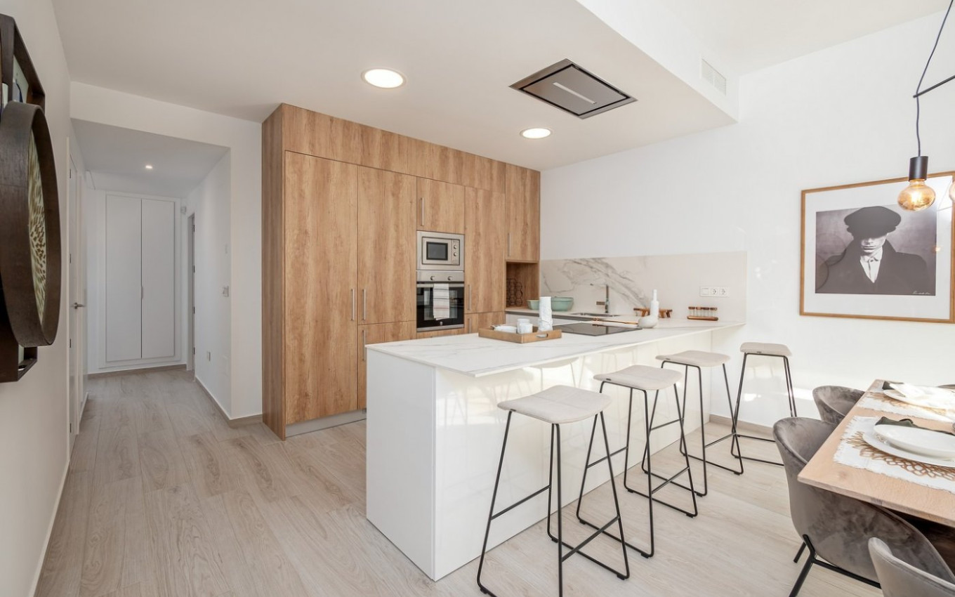 LUXURY VILLA NEXT TO THE GOLF COURSE. Enjoy the tranquility of living in a privileged environment. Its unique location next to La Finca Golf Course With a relaxed and healthy landscape surrounded by nature and with a wide range of sports and leisure services. A few kilometers from the most impressive beaches on the Costa Blanca. These villas connect us with ancient Mediterranean cultures and the tradition of construction combined with modern architecture to create charming houses, the best in space and design trends. On one floor, designed to make the most of the light, with an "L" distribution, which perfectly separates the living and kitchen areas from the rest areas. The houses have 3 bedrooms and 2 bathrooms, on large plots of more than 300 meters, with private pool, parking area and solarium, within the best golf environment. All the villas are delivered with aerothermal, pre-installation of ducted air conditioning, home automation, aluminum windows with electric shutters, kitchen furniture, alarm, bathrooms equipped with furniture, screen and underfloor heating, or automatic irrigation in the garden, among others.